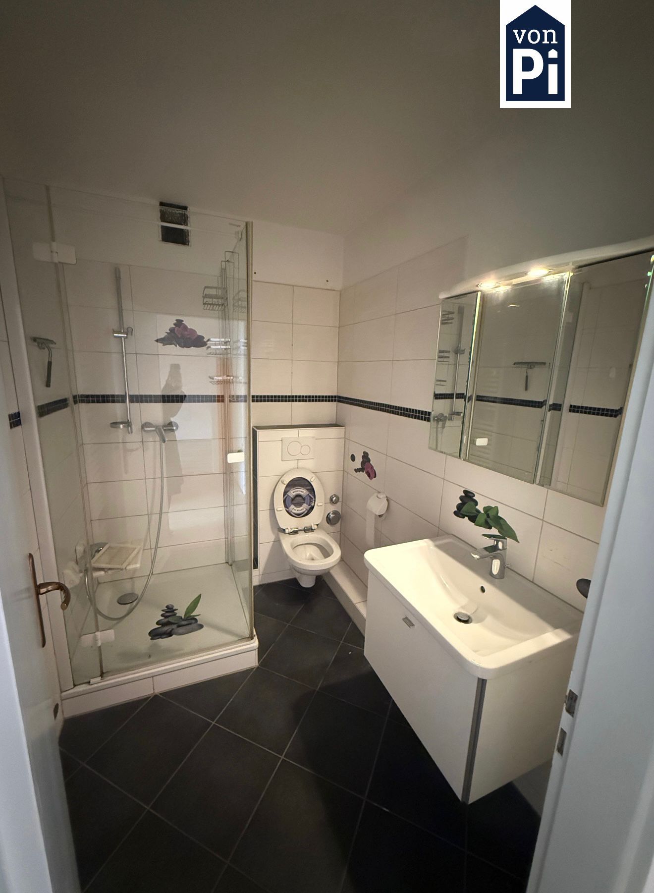 Das Badezimmer ist mit einem WC, einer Dusche mit Abtrennung, einem Waschbecken sowie einem Wandregal mit Spiegel ausgestattet.
