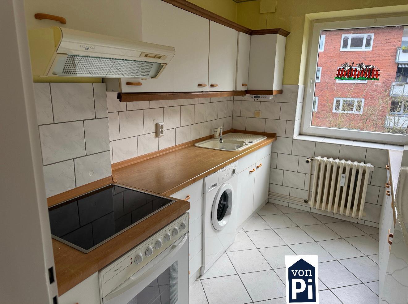 Die Wohnung ist mit einer Einbauküche ausgestattet, die einen Herd, eine Abzugshaube, einen Backofen, einen Kühlschrank, eine Spüle sowie eine Waschmaschine umfasst.