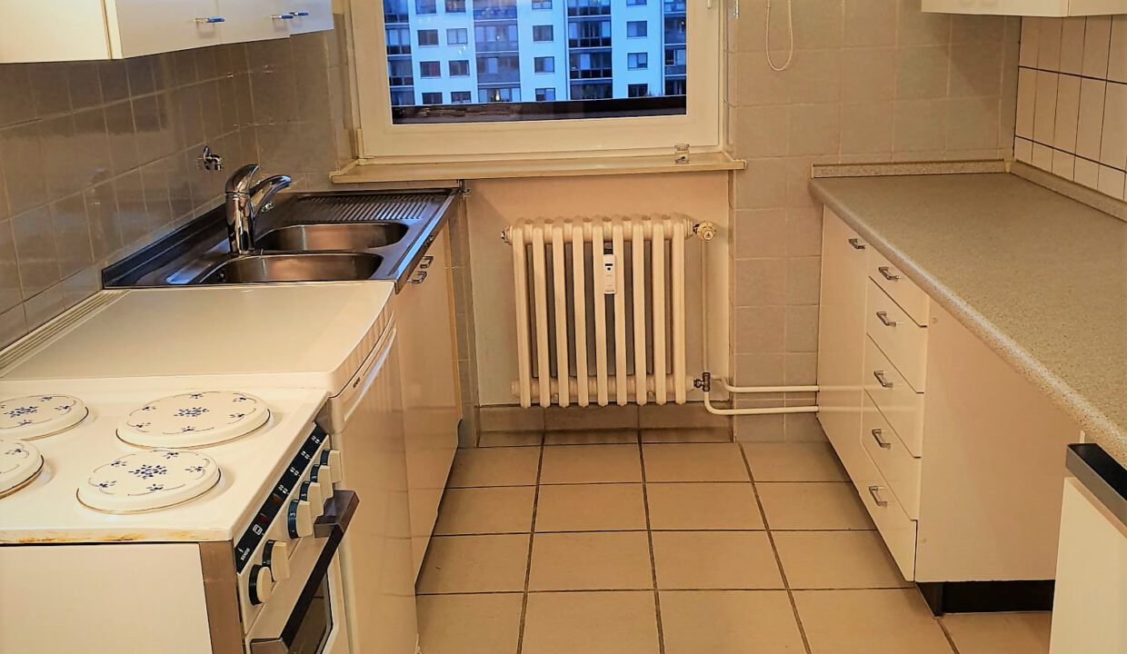 Küche mit Herd und Backofen, Kühlschrank, Unter- und Hängeschränke, Platz und Anschluss für einen Geschirrspüler. Bad, Gäste-WC, Küche und Flur sind gefliest, Kinderzimmer ist mit einem Teppich ausgelegt, das Schlafzimmer hat einen Linoleum-Belag, Wohnzimmer/Arbeitszimmer hat einen Parkettfußboden.